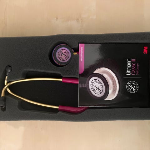 3M Littmann Classic III stetoskop i blått. Stetoskopet har to hodestykker for ulike lyttemuligheter og er egnet for medisinsk bruk. Leveres med ekstra deler og oppbevaringsetui.