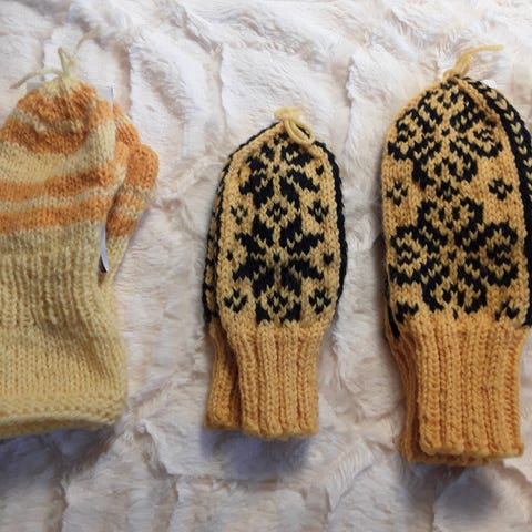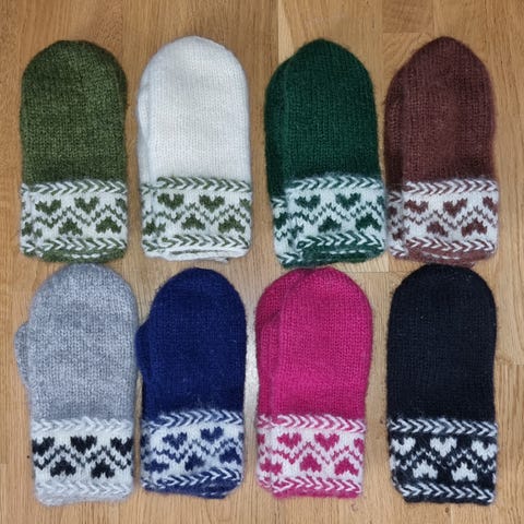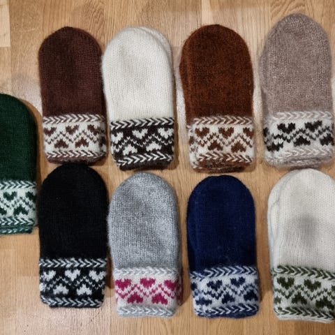 Hjemmestrikket votter selges. De er strikket i Alafosslopi.