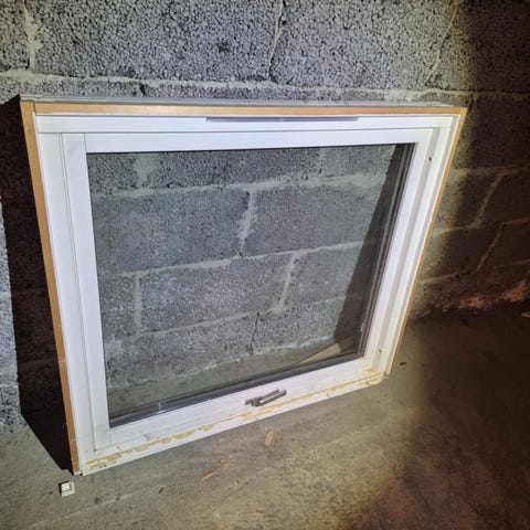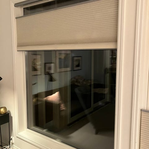 Terrassedører og stort vindu med tilhørende plissegardiner (beige/lys grå) fra Luxaflex. Størrelser som angitt på tegning. Trelags glass, hvite karmer.