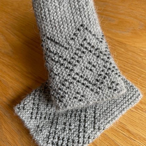Pulsvarmere strikket i Alpaca Bris fra Viking. De hvite er str Small, de lyse grå er Medium og de mørkegrå Medium/Large. Kr 100 pr par. Porto kommer evt til.