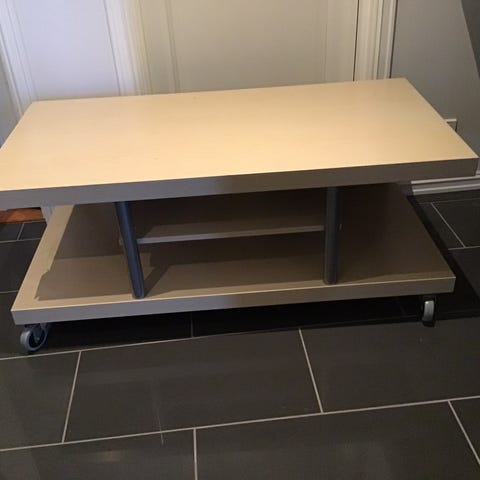 Praktisk TV-benk med plass til bøker og utstyr under pluss egen hylle.