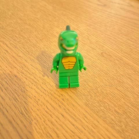 LEGO Super Mario figur i plast, med karakteristisk design fra Super Mario-serien. Figuren er montert på en grønn baseplate og har detaljer som ansikt, armer og klær i flere farger.