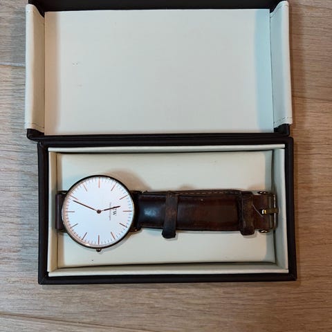 Pen og svært lite brukt klokke fra Daniel Wellington med svart reim. Klassisk og stilren