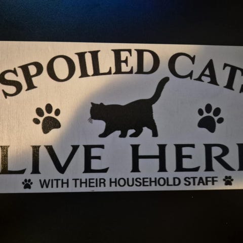 Skilt i tre liknende materiale med svart bakgrunn og utskjært bokstaver. Utstyrt med snor for oppheng.