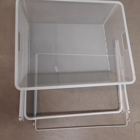 Elfa stativ med 5 skuffer i forskjellig størrelse. Beina ser ut til å være noe å bygge på (se bilde). Hvis du har mer Elfa vet du kanskje hva det innebærer. Dette er eneste vi har, som fulgte med leiligheta.