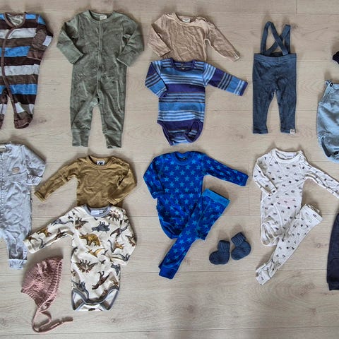 Mellomstor klespakke til gutt i str. 68/74. Forbehold om at bruksmerker kan forekomme, da klærne er godt brukt. De grønne bodyene har noen små flekker og den lyseblå ullbodyen har små rifter og flekker (se bilder).