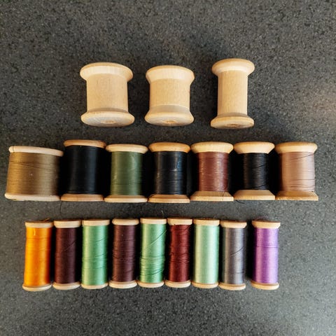12 norskproduserte gamle trådsneller av tre, C.B.L. og CEBELLE.