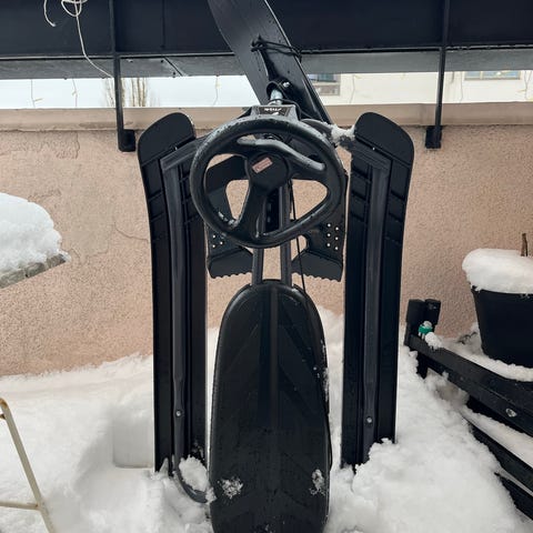 Fremskia er byttet ut, og siden er snowraceren lite brukt. Noe mer slitt på sideskiene, men den har blitt ganske godt tatt vare på og er relativt lite brukt av en som ikke var superbegeistra for aking.