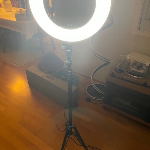Ringlys med innebygd stativ og telefonholder. Passer til bruk ved fotografering eller videoopptak for å gi jevn belysning. Kan plasseres på bord eller andre flater for stabilitet. 3 forskjellige lys, med dimmer. Må kobles til kontakt i veggen.