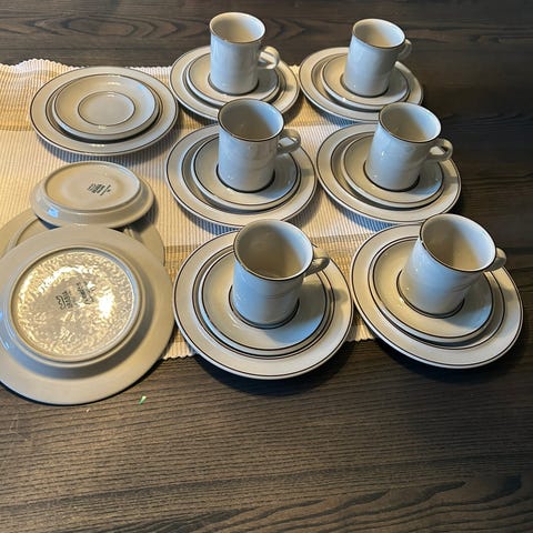Arabia fennica servise i keramikk bestående av flere deler inkludert kopper, skåler, fat og tekanne. Serviset har en enkel hvit design med brune kanter. Passer til daglig bruk eller servering.