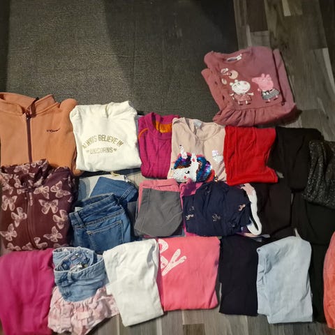 Klespakke til gutt der mesteparten er fra 3 til 6 år. Unntaket er løvedrakten som er 2 år. Wheat-jakke i størrelse 110. Det samme er regnbuksen fra Helly Hansen og dongerijakken. Ellers er det ullklær fra Joha, Janus, Vilje & Ve, og noe hjemmestrikket. Pent brukte klær.