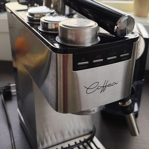 L'Or Espressomaskin i svart farge. Maskinen har et kompakt design med avtakbar dryppskål og vanntank. Strømtilkobling via ledning.