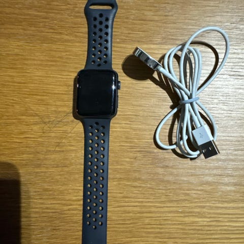 Apple Watch smartklokke med beige silikonrem. Inkluderer lader og original emballasje. Passer til daglig bruk og aktivitetsmåling.
