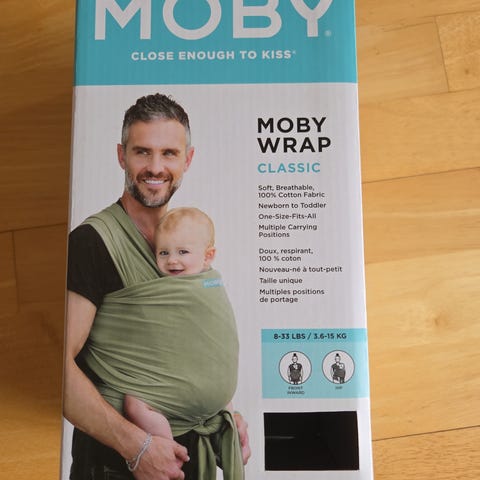 Babynest av merket voksi. Den er blå og grå med detaljer i skinn. Skinndetaljene er litt medtatt fordi trekket har vært vasket i vaskemaskin.