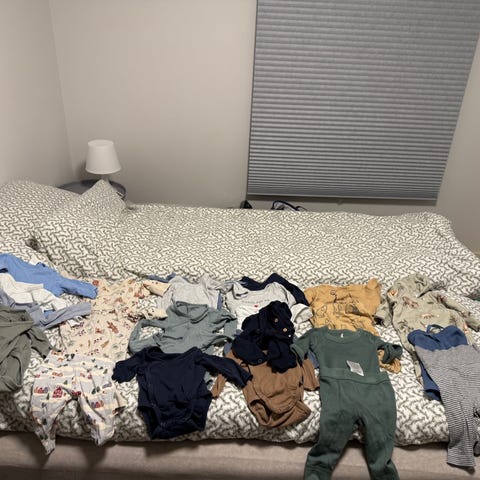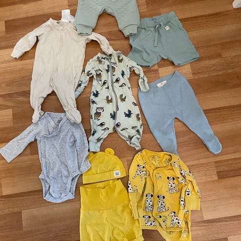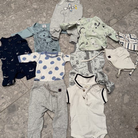 Barneklær for gutt i størrelse 56. Plaggene er flerfarget og laget av bomull. Inneholder flere pysjer med ulike mønstre og farger, egnet for små barn.