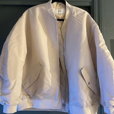Kul bomberjakke med dekorative detaljer på ermer og rygg. Materialet er glatt, og har glidelås i front.