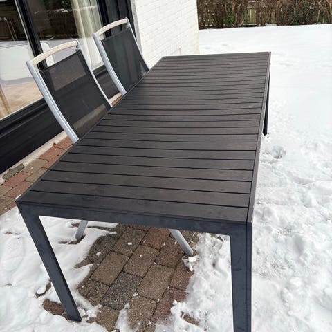 Ukjent merke hagemøbler som inkluderer et bord og flere stoler. Møblene har en kombinasjon av hvite og grå farger. Materialene ser ut til å være tre og metall. Bordet har en rektangulær form med ben som krysser hverandre. Stolene har en ramme i metall med sete og rygg i trelameller. Det er synlige tegn på bruk og slitasje, blant annet en skade på bordplaten.