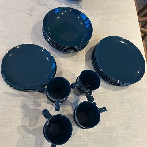 Selges 18 glass i klart glass, som står å samler støv. Settet er kjøpt på Skeidar.