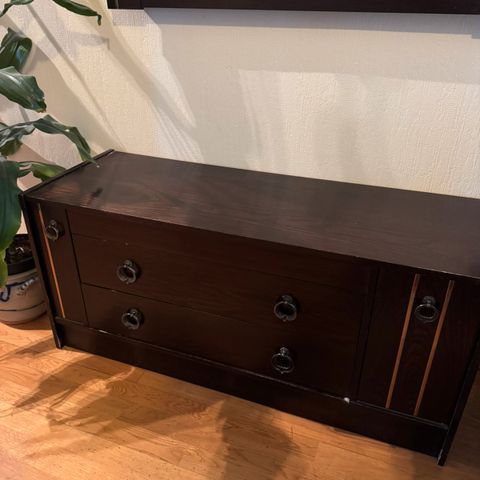 Glassplate på toppen beskytter kommoden. Dette har noen flekker. Hvis den demonteres kan det lett fikses vil jeg tro.