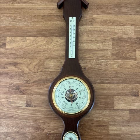 Barometeret er mekanisk (aneroid) og krever ingen strøm. Passer perfekt til hytte, båt, stue eller som gave.