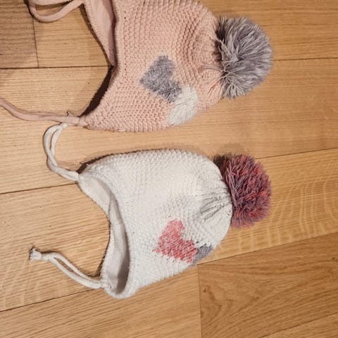 Sett med 2 brukte vinterluer til baby – én kremfarget og én blå. Myke og behagelige luer som sitter godt på hodet og gir god beskyttelse mot kulde. Laget av elastiske materialer for komfortabel passform. Søt modell med ører.