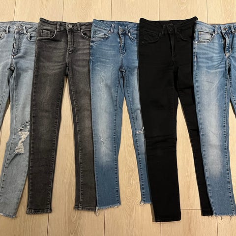 2 kule klassiske Levis 501 + beige linbukse og 2 blå chinos