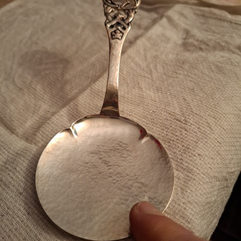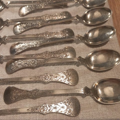 6 fruktkniver i nysølv. Knivbladet er i rustfritt stål . Knivene er brukt men pent behandlet. Ligger i plast når de ikke er i bruk