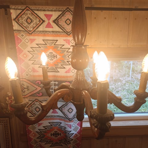 Har vært brukt inntil nylig. Lampen har fått nye innvendige ledninger og er pent renovert. Dimbare lyspærer medfølger. Må hentes på Gründerløkka i Oslo.