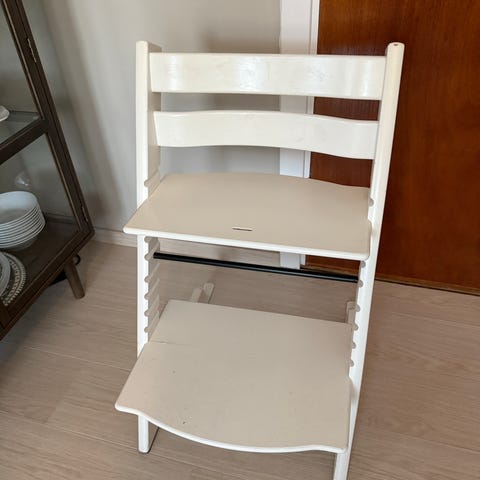 Selger en hvit Stokke tripp trapp stol. Brukt av ett barn. Noen få bruksmerker, men ellers i veldig god stand. Tippesikring på begge bein.