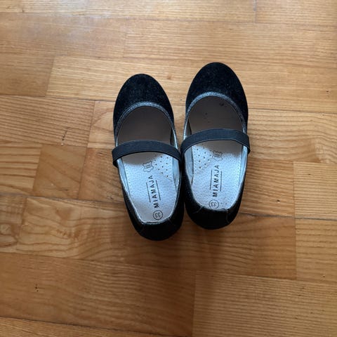 Barnesko for jente i størrelse 33 med sølvglitter. Skoene har en lav hæl og borrelåsrem for enkel justering og påkledning. Egnet for formelle anledninger eller festbruk.