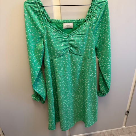 Selger rosa kjole med prikker i ulike farger. Kun brukt en gang, ingen bruksmerker.