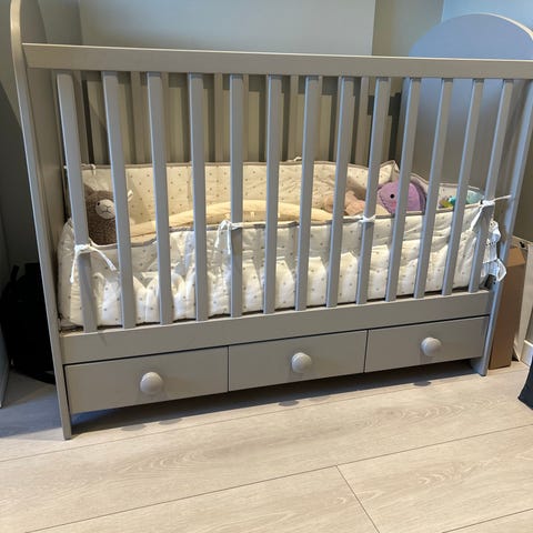 Leier ut en Moonboon-vugge med flat bunn. Vuggen er kjøpt høsten 2025 og brukt i noen måneder til ett barn.