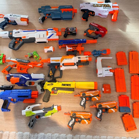 Stor samling Nerf våpen og tilbehør. Pris står under hvert bilde. Om noen ønsker å kjøpe alt så blir vi nok enige om en god pris.