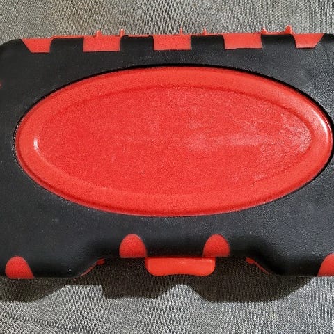 Trolig flight case eller hardcase. Stor beholder med hjul.
