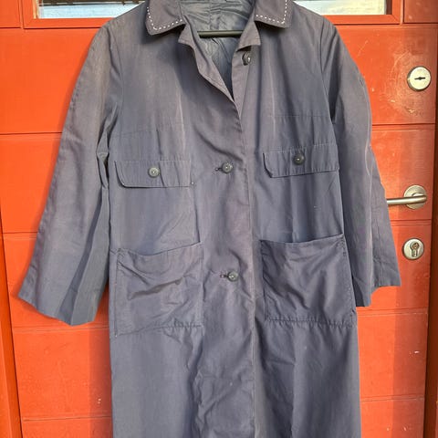 Herlig frakk med 80-tallslook. Tidstypiske runde skuldre og nett, liten krage. Trykknapper som lukkemekanisme foran og på ermene, skrålommer og frakkeskjøt bak. Foring i øverst del av ryggen. Forseggjort kvalitetsplagg i halvtykk bomull laget i Norge. Det er svakt jordslag på høyre side foran og på høyre erme, se bilder. Ikke veldig synlig, eventuelt kan farging kanskje være aktuelt? Et artig plagg som fortjener å bli med videre! Pent brukt en periode. Bærer preg av å være ustrøket på bilde. Gi gjerne bud ved interesse. Sender gjerne.