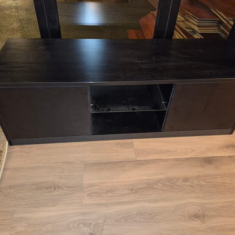 Vogue mediabenk fra Decotique til salgs. Stilren, tidløs og praktisk benk i fargen antrasit. Benken har to skyvedører og fem smale messingben for et eksklusivt inntrykk. To seksjoner med en flyttbar hylle i hver seksjon som kan tilpasses etter smak og behov og to hull bakpå for ledninger og kabler.