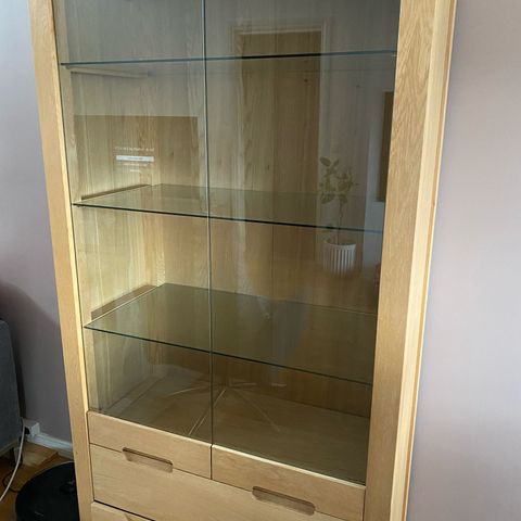 Solid vetrine og skap i beiset eik