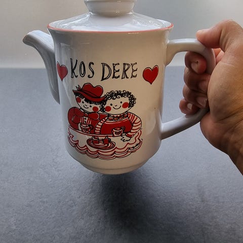 Denne har blitt brukt som øsekar på kjøkkenet i hytta vår og når den ikke har blitt brukt så har den stått til pynt på en skjenk, kommode fordi den er så dekorativ og flott .