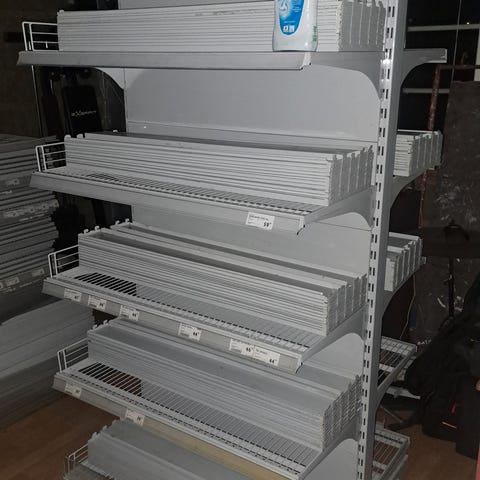 Sett med butikkhyller og salgsdisplayer i tre og metall, inkludert svarte hyller med flere nivåer for oppbevaring av varer, og en kvadratisk hvit salgsdisplay med svart topp og hull i midten. Hyllene er egnet for organisering og visning av ulike produkter i butikkmiljø.