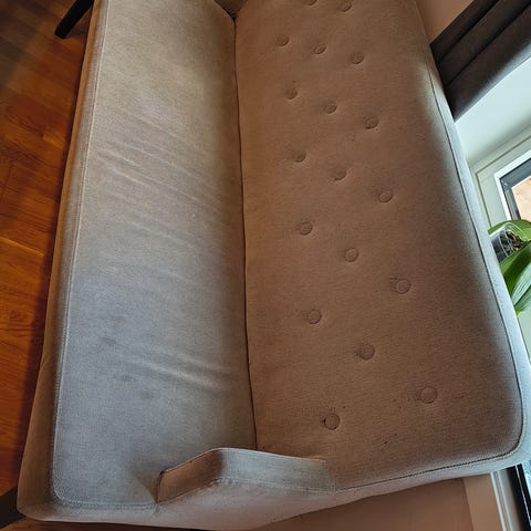 Godt brukt, men mye bruk igjen. Noe merker her og der fra katt som har klort i hjørnet. Men god å sitte i.