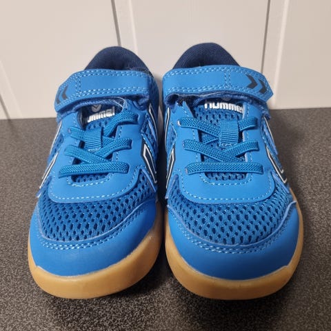 Hummel barnesko for gutt i størrelse 27. Skoene er blå og har borrelåsfester for enkel på- og avkledning. Egnet for daglig bruk, gym og aktiviteter.