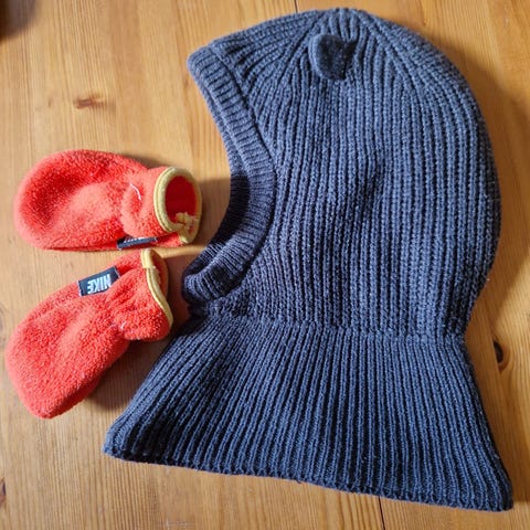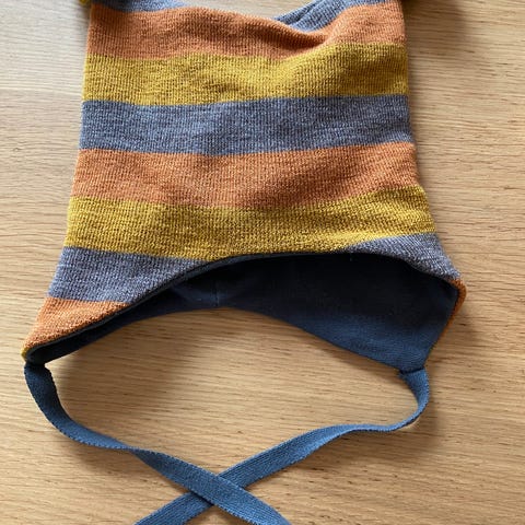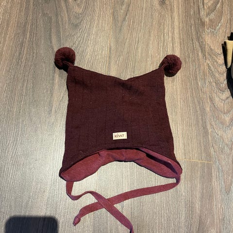 Kivat rød lue med dusker, str 2. Se bildet av den ene båndet, der er det noe slitasje. En Joha ull-lue str 4-9 mnd.