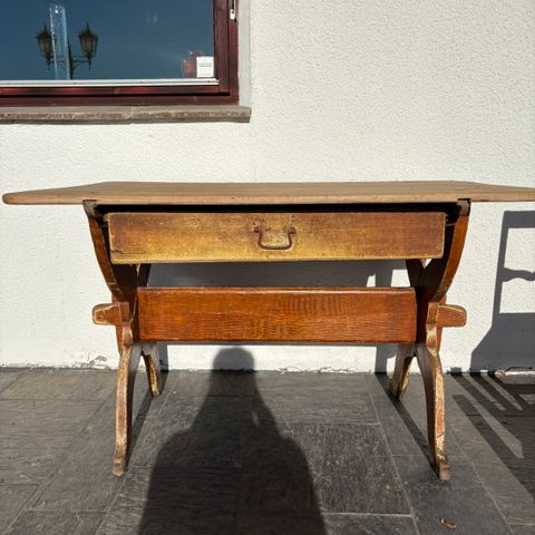 Massivt bord i tre, og lærbetrukket bordplate, læret er med ett preget mønster.