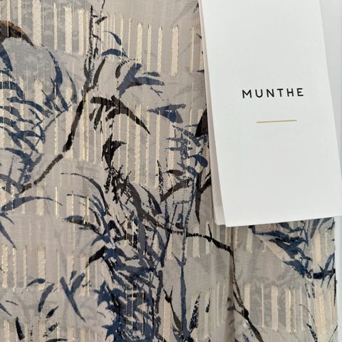 Munthe Hverdagskjole i størrelse S, laget av silkemateriale. Kjolen har flerfarget mønster og er designet for kvinner.