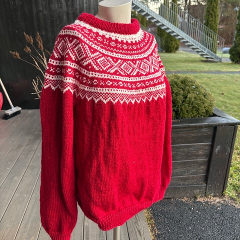 Ulvenatt genser strikket av møster fra Linka Neumann. Rød bunnfarge. Det er brukt alafosslopi garn. En god og varm genser. Selges fordi jeg har for mange ullgensere. Størrelse M, men passer også en L. Hel lengde: 69 cm, overvidde 47 cm og underarm 48 cm.