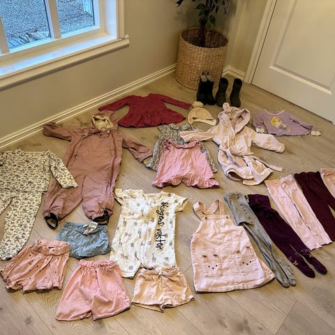 Inneholder jakker, kortermet kjoler, strømpebukser (2 i ull), tightser, bukse, gensre, noen sokker 19-21. En morgenkåpe i str 92 følger også med.