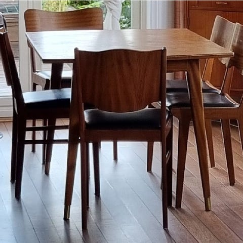 Selger 3 stoler i svart og teak, litt slitt i malingen, men ellers veldig fine .
