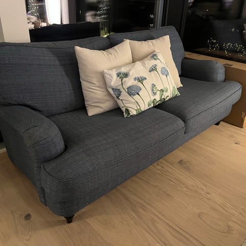 Sofaene ble innkjøpt fra Bohus og heter Howard. Design er via Furninova. Den buede sofaen er lengre enn målene over, bredden er 247 cm. Prisen under er kr 8.000,- for begge eller enkeltvis kr 4.000.-. Sofaputene er fylt med dun og er uten flekker. Kun Vippsbetaling og henting på aktuell adresse. Sender ikke.