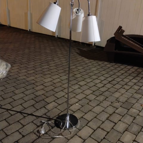 3 år gammel 5 armet stålampe i stål, vet ikke om den kan dimmes. Skjermene burde byttes. Selges høystbydende over 1300kr. Budslutt settes etter første bud. Kan ikke sendes.