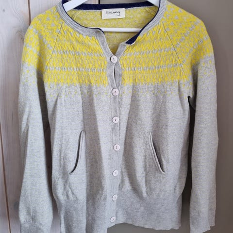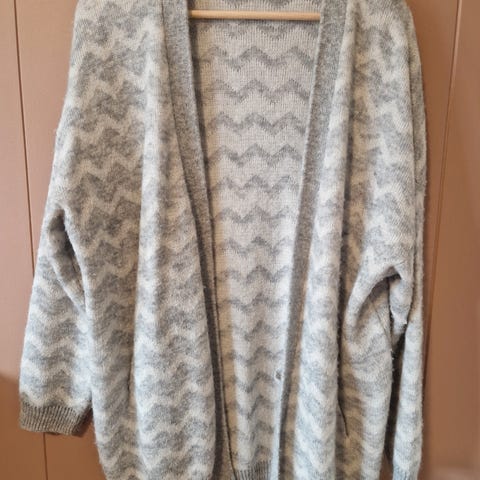 Middels tykk helt ny og ubrukt cardigan av lammerull fra IisWoodling. Str L, men oppleves mer som en M. Har knapper i front. Fargene er beige, sort og lys blågrå.